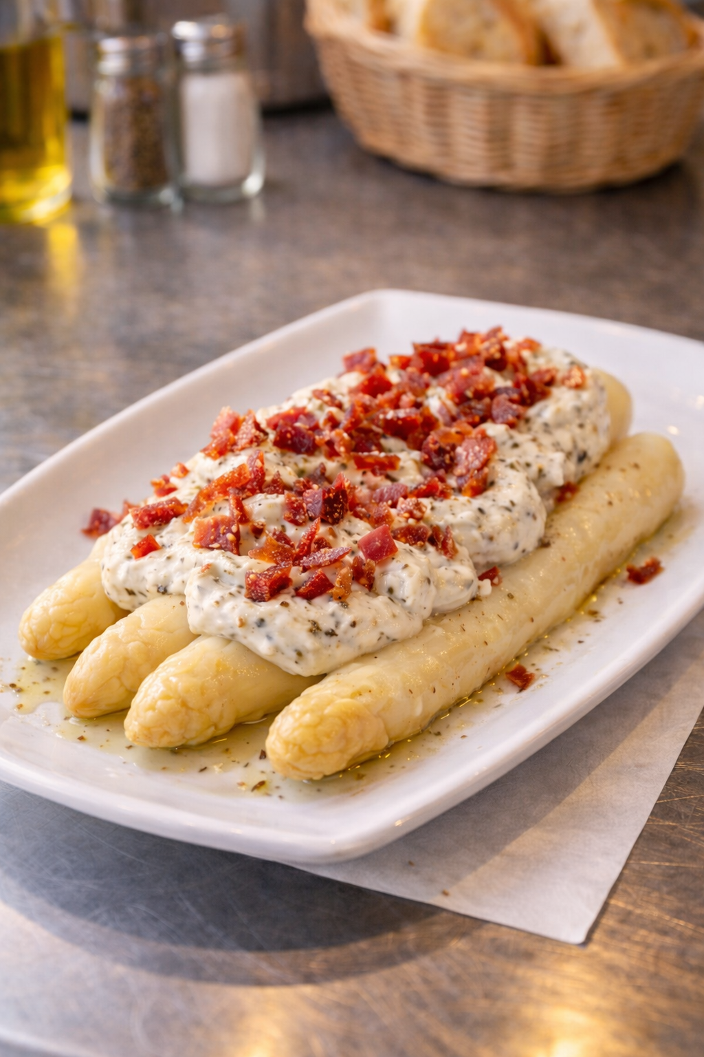 - Espárragos blancos con mayonesa de trufa y crujiente de jamón Ibérico. 14€