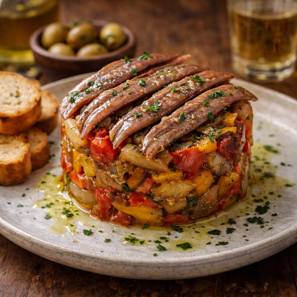 • Bacalao al horno, muselina suave de ajo y pisto manchego