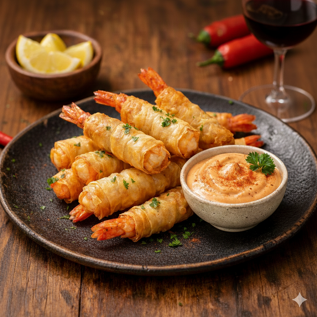 • Cigarritos de langostinos con mayonesa de pimentón.