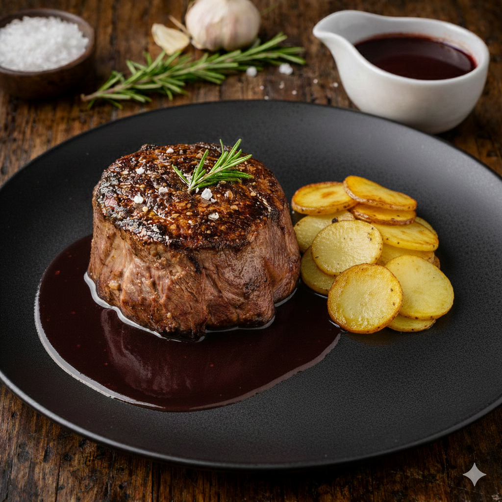 • Solomillo de vaca madurada a la brasa, reducción de garnacha y patatas.
