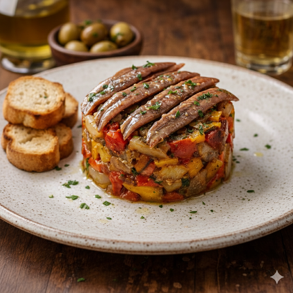 • Timbal de escalivada con anchoas del Cantábrico.