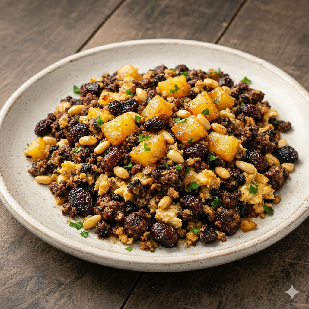 • Revuelto de morcilla con piñones, pasas y manzana confitada.