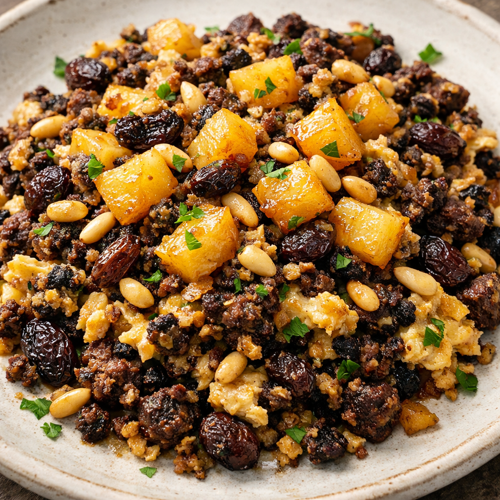 • Revuelto de morcilla con piñones, pasas y manzana confitada